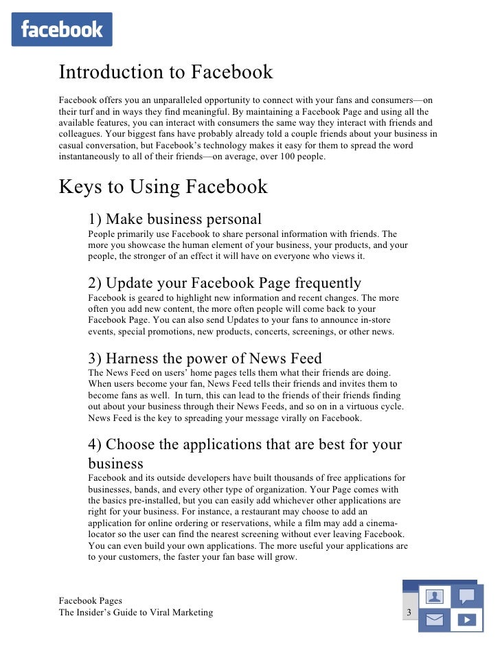Advanced Facebook Marketing Strategies: How to Use the World’s Most Popular Online 30 Facebook ® Activities for Viral Visibility 1. Update your status 2. Comment on your friends’ status 3. Upload photos 4. Tag photos 5. ... Document Retrieval